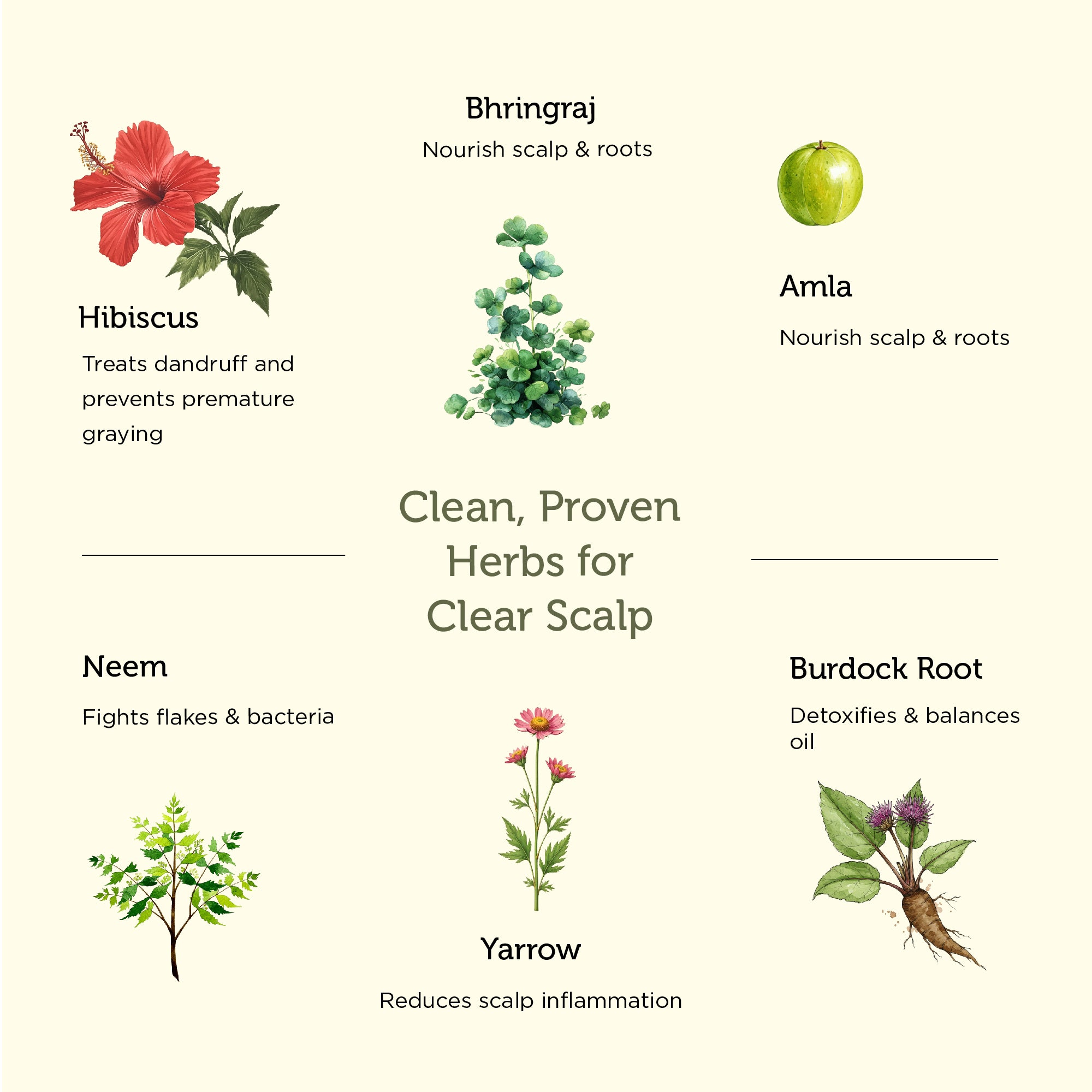 Neem, Yarrow & Burdock fight the root causes of dandruff while protecting the scalp from further irritation or buildup.