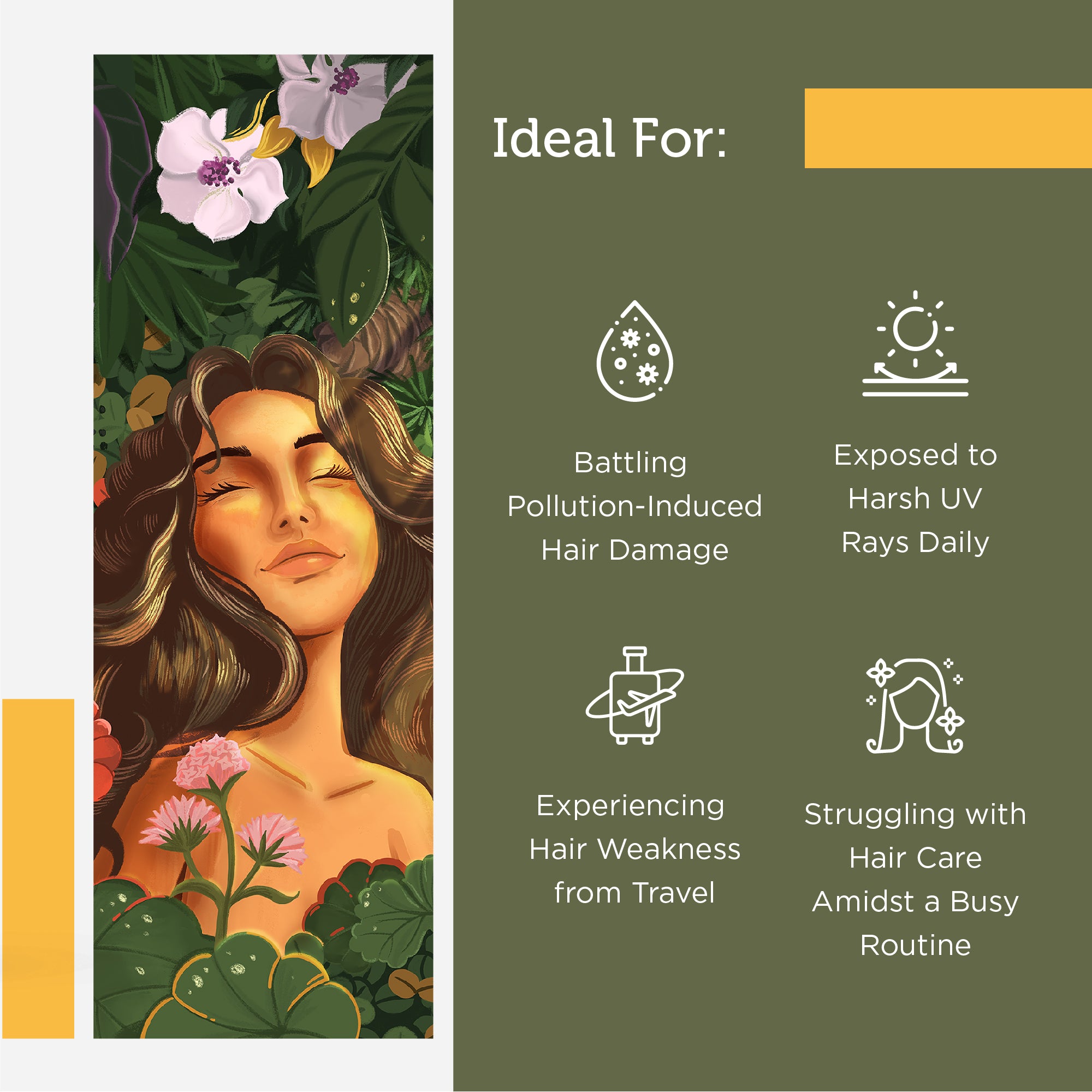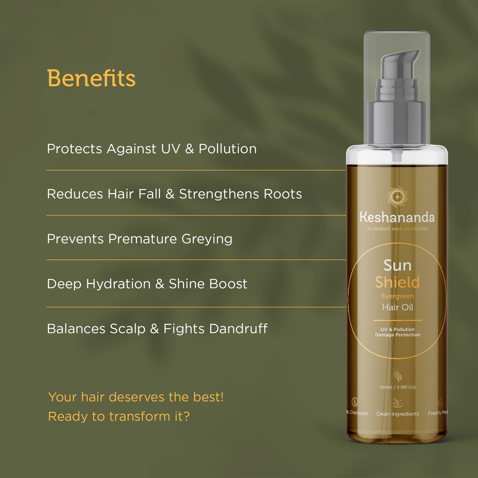 Infused with sun-powered Ayurvedic herbs, this oil forms a natural UV barrier, preventing damage from heat and harsh sun exposure.